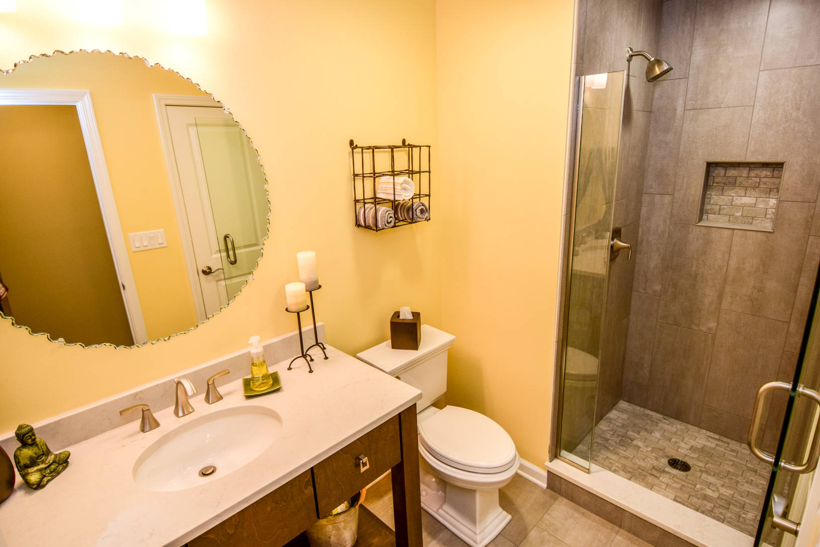 A summery yellow brightens up this bathroom, complemented by a gray shower. The combination is reminiscent of Pantone’s 2021 Paint Colors of the Year.